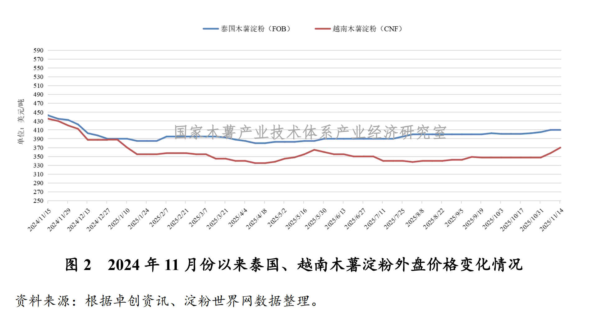 从外盘木薯淀粉市场行情来看,由于鲜薯原料供应增量有限,本周泰国木薯淀粉产量与上周大体持平,成品库存量持续下降;越南木薯淀粉产量有所回落。受中国港口库存大幅回落和国内需求量回升等因素影响,泰国木薯淀粉出口总体呈震荡上升态势,越南木薯淀粉出口总体呈持续反弹态势。本周泰国木薯淀粉价格稳定,越南木薯淀粉价格上升。其中,泰国和越南木薯淀粉报价区间为FOB(曼谷)400~420美元/吨(约合人民币2832.00~2973.60元/吨);越南木薯淀粉报价区间为CNF360~380美元/吨(约合人民币2548.80~2690.40元/吨),较上周增长12.5美元/吨(见图2)。