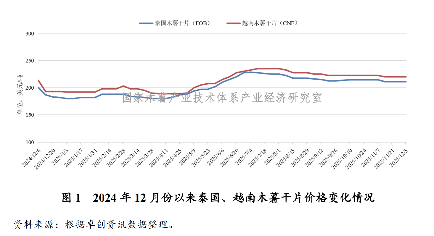 12.泰国和越南木薯干片市场价格保持稳定,泰国木薯淀粉市场价格稳定,越南木薯淀粉市场价格上升,国内木薯淀粉市场价格总体下行。