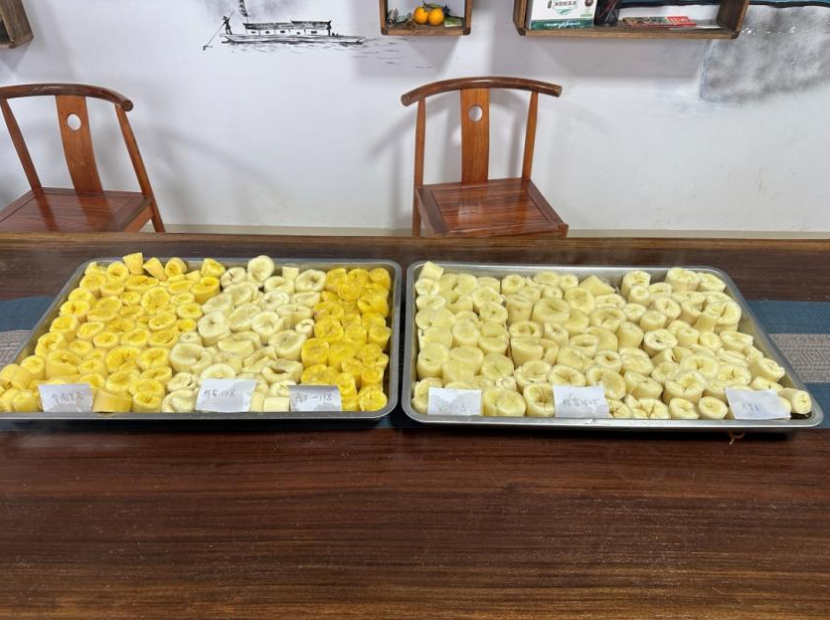 随后专家团队到武鸣综合试验站嘉沃合作社基地,查看木薯品种小区试验、区域试验、新品种示范区,现场采拔了华南9号、桂薯1508、桂薯1505、GR891等6个食用木薯品种并现场蒸熟,对这6个品种的食用木薯香气浓郁度、口感软糯度、色泽美观度逐一进行对比及品评。