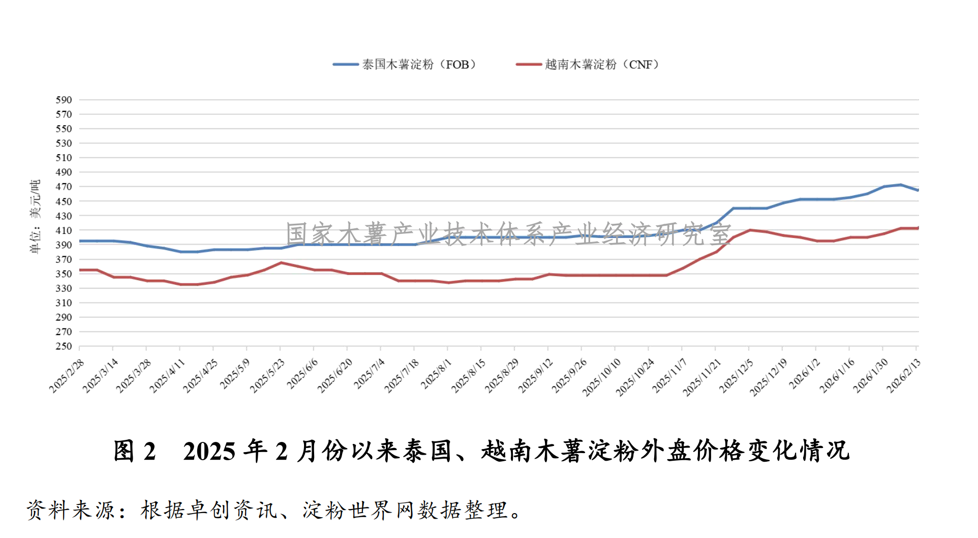 从外盘木薯淀粉市场行情来看,由于泰国和越南鲜薯原料供应不足导致木薯淀粉新增产量有限,本周泰国和越南木薯淀粉价格上升。其中,泰国木薯淀粉报价区间为FOB(曼谷)445~505美元/吨(约合人民币3083.85~3499.65元/吨),较2月12日上涨10美元/吨;越南木薯淀粉报价区间为CNF430~450美元/吨(约合人民币2979.90~3118.50元/吨),较2月12日上涨27.50美元/吨(见图2)。