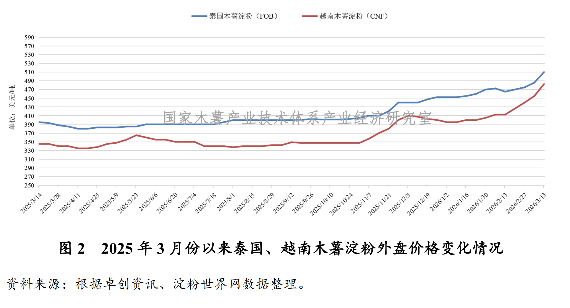 从外盘木薯淀粉市场行情来看,受淀粉产量和库存量不足、生产成本偏高及中东和西亚地区局势动荡等综合因素影响,泰国木薯淀粉出口总体维持震荡上涨态势;受鲜薯原料不足、价格持续上涨和中东爆发战争等因素影响,越南木薯淀粉出口呈震荡上涨的态势。本周泰国和越南木薯淀粉价格持续上升。其中,泰国木薯淀粉报价区间为FOB(曼谷)500~520美元/吨(约合人民币3450.00~3588.00元/吨),较上周上涨22.50美元/吨;越南木薯淀粉报价区间为CNF470~495美元/吨(约合人民币3243.00~3415.50元/吨),较上周上涨27.50美元/吨(见图2)。