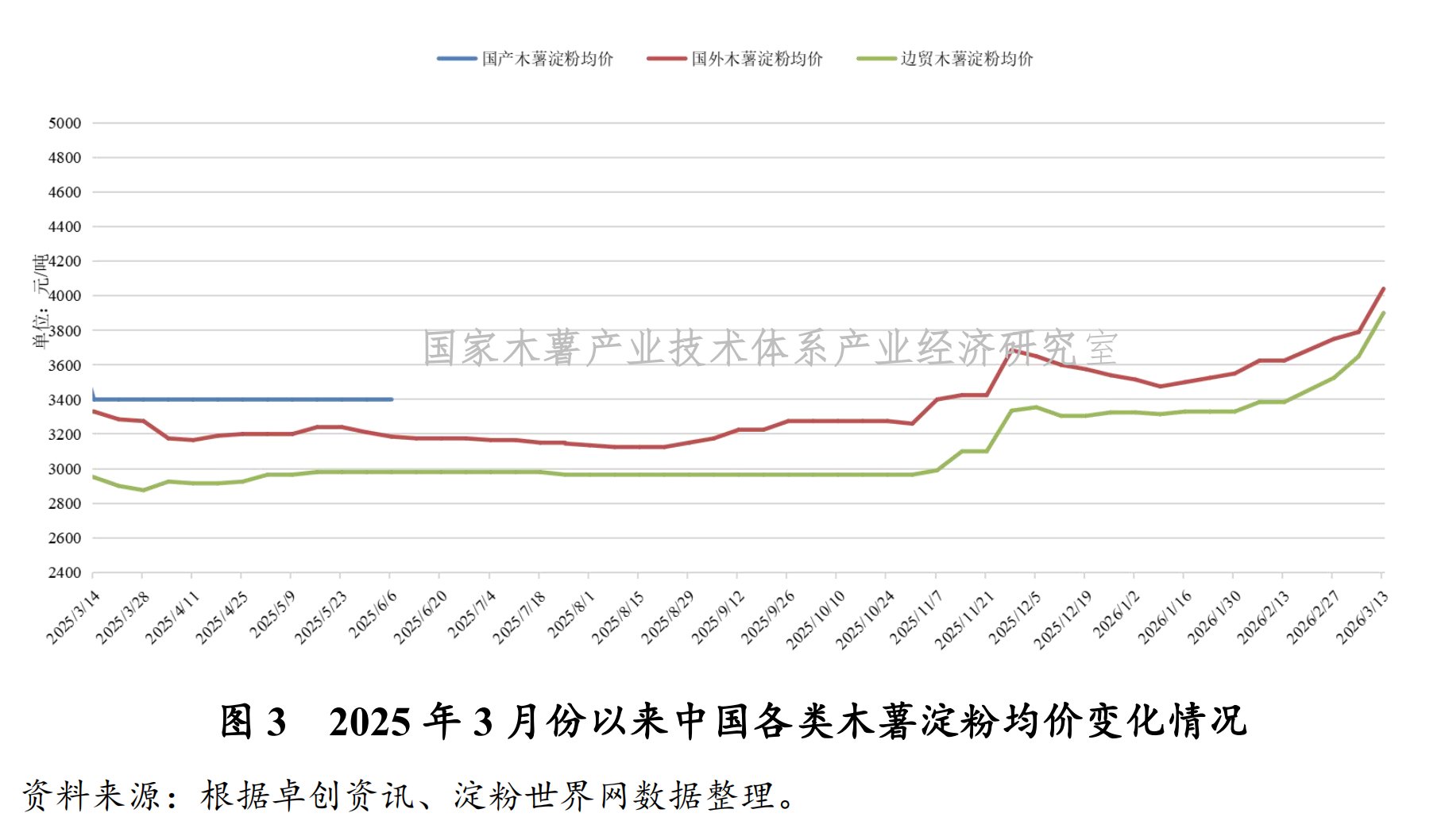 本周国内木薯淀粉价格持续上升。其中,泰国中高端木薯淀粉含税报价为4000~4200元/吨,较上周上涨275元/吨;越南主流木薯淀粉含税报价为3750~3880元/吨,较上周上涨275元/吨;广西边贸市场主流木薯淀粉报价为3800~4000元/吨,较上周上涨250元/吨;国产木薯淀粉同样呈上涨态势,较上周上涨50~100元/吨,其中广西木薯淀粉报价4050~4150元/吨,云南木薯淀粉报价3750~3850元/吨。(见图3)。