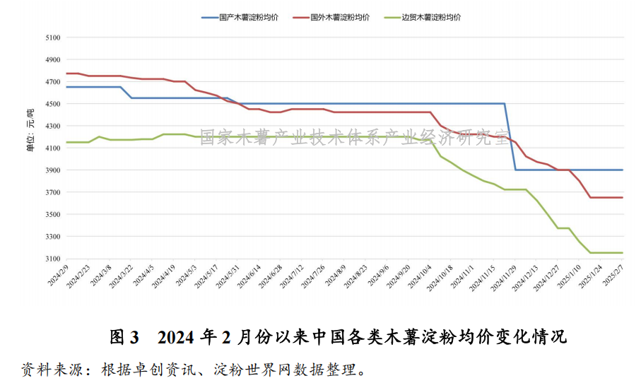 近期国内木薯淀粉市场需求趋弱,本周国内木薯淀粉价格总体稳定。其中,泰国中高端木薯淀粉含税报价为3300~4000元/吨;越南主流木薯淀粉含税报价为3050~3300元/吨;广西边贸市场主流木薯淀粉报价为3050~3250元/吨;国产木薯淀粉厂家的主流木薯淀粉报价为3900~4000元/吨(见图3)。