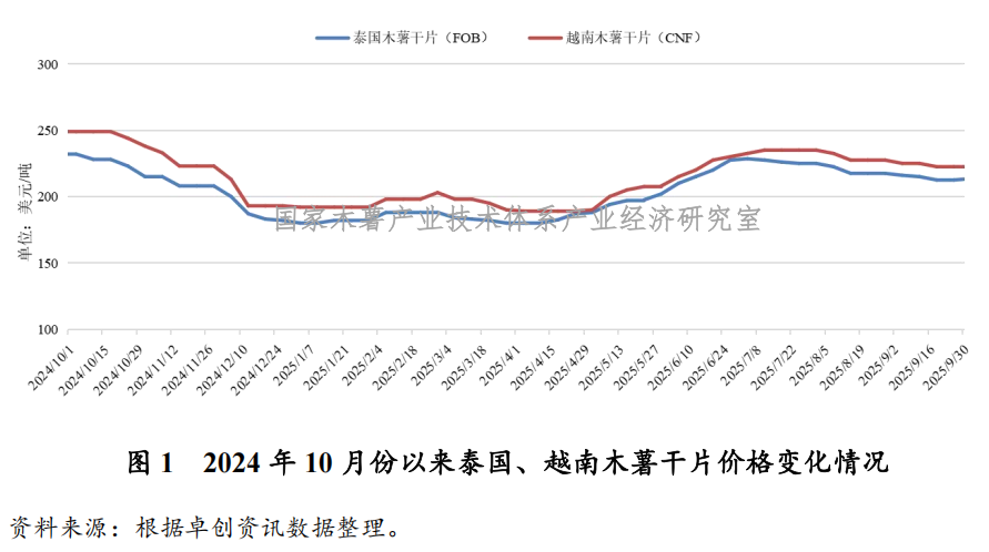 泰国木薯干片市场价格上升,泰国木薯淀粉市场价格回落,国内木薯淀粉市场价格有所下降。近期,泰国和越南鲜木薯因雨季收购难度增大,木薯干缺乏晾晒条件,导致市场供应量有限,多数工厂持观望心态。本周泰国木薯干片市场价格上升,越南木薯干片市场价格稳定。其中,泰国木薯干片报价区间为FOB(曼谷)212~215美元/吨(约合人民币1507.32~1528.65元/吨),较上周上涨1美元/吨;越南木薯干片报价为CNF220~225美元/吨(约合人民币1564.20~1599.75元/吨)(见图1)。