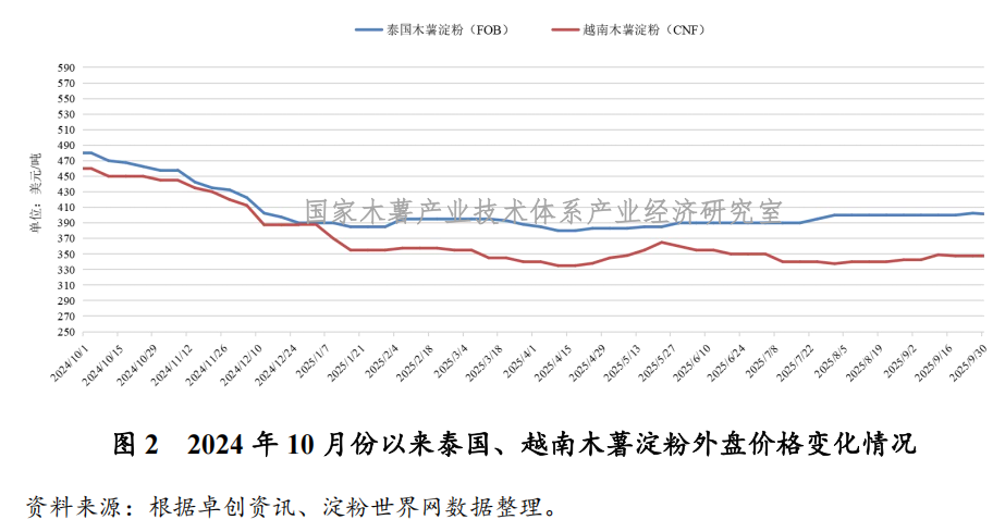 从外盘木薯淀粉市场行情来看,由于鲜薯原料供应减少,本周泰国木薯淀粉产量下降,淀粉厂下游新增订单有限;越南淀粉加工厂以执行前期订单为主。本周泰国木薯淀粉价格回落,越南木薯淀粉价格保持稳定。其中,泰国木薯淀粉报价区间为FOB(曼谷)390~412美元/吨(约合人民币2772.90~2929.32元/吨),较上周下降1.50美元/吨;越南木薯淀粉报价区间为CNF340~355美元/吨(约合人民币2417.40~2524.05元/吨)(见图2)。