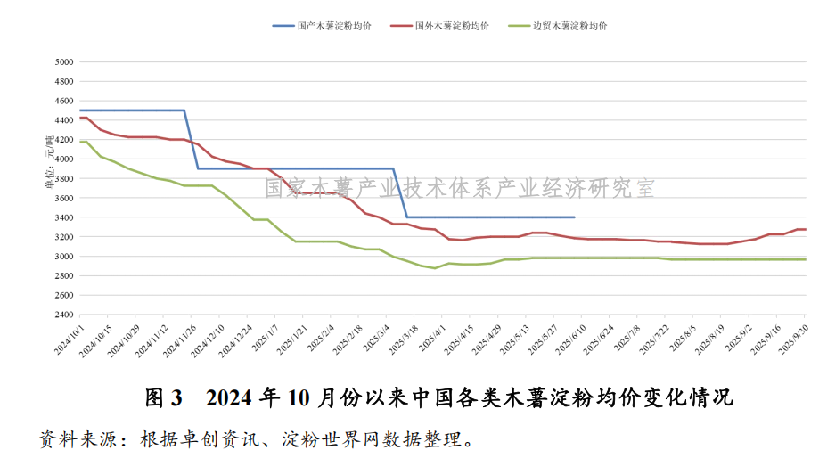 本周国内木薯淀粉价格有所下降。其中,泰国中高端木薯淀粉含税报价为3200~3600元/吨;越南主流木薯淀粉含税报价为2800~2950元/吨,较上周下降10元/吨;广西边贸市场主流木薯淀粉报价为2850~3080元/吨;国产木薯淀粉库存量持续减少,厂家暂停报价(见图3)。