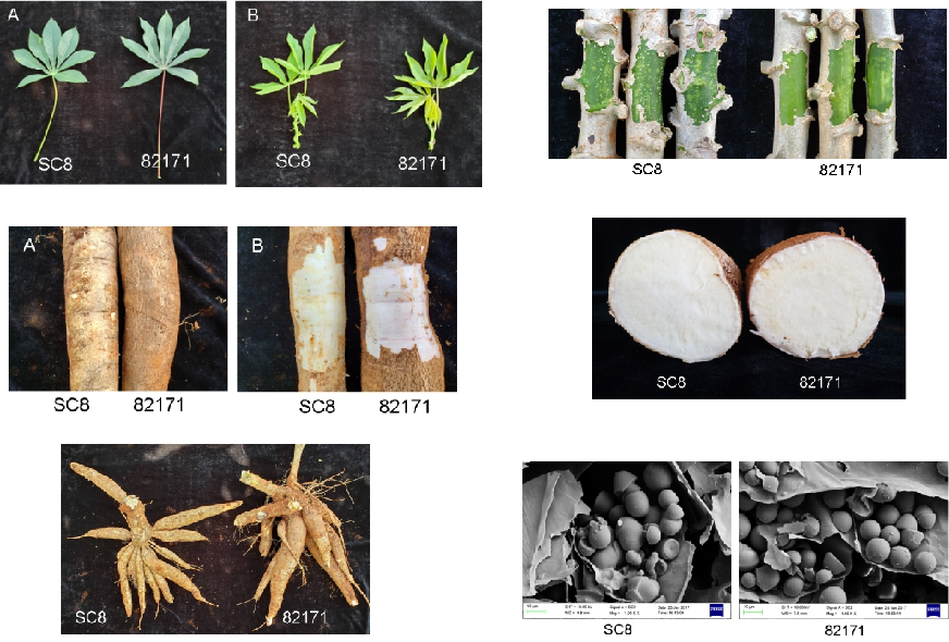 广西大学以木薯品种华南124作为材料,经辐射诱变获得辐选01木薯品种。茎秆耐贮藏,适应性广,结薯多,块根粗长,结薯集中而且较浅,容易收获。热科院生物所以木薯品种华南8号作为材料,经辐射诱变获得82171木薯品系,该品系具有高产、抗逆性强、适于高海拔种植等特点。