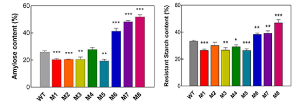 木薯育种技术与方法岗位,采用双sgRNA CRISPR/Cas9系统,对木薯淀粉分支酶基因SBE2开展基因编辑,获得了直链淀粉以及抗性淀粉含量都显著高于野生型的突变体木薯。