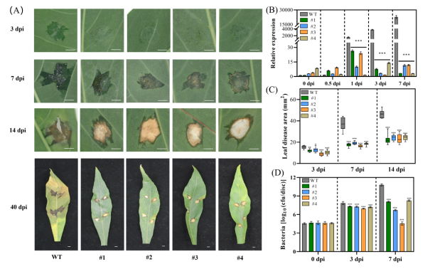 木薯抗逆材料创制岗和生物防治和综合防控岗联合,利用CRISPR/Cas9基因编辑技术成功编辑了SC8木薯品种感病基因MeSWEET10a的启动子区域,显著提高了木薯对细菌性枯萎病(CBB)的抗性。