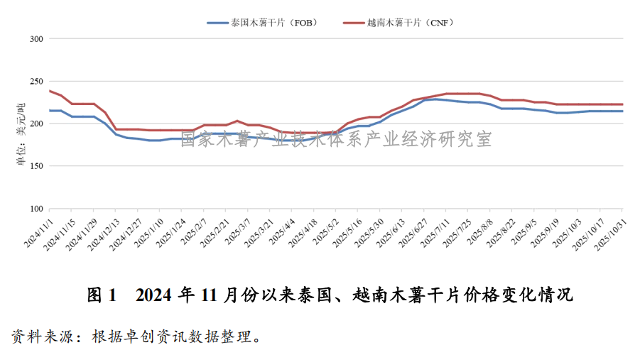 泰国和越南木薯干片市场价格保持稳定,泰国木薯淀粉市场价格上升,国内木薯淀粉市场价格有所上升。近期,泰国和越南鲜木薯因雨季收购难度增大,木薯干缺乏晾晒条件,导致市场供应量有限,工厂持续持挺价心态。本周泰国和越南木薯干片市场价格保持稳定。其中,泰国木薯干片报价区间为FOB(曼谷)214~215美元/吨(约合人民币1517.26~1524.35元/吨);越南木薯干片报价为CNF220~225美元/吨(约合人民币1559.80~1595.25元/吨)(见图1)。