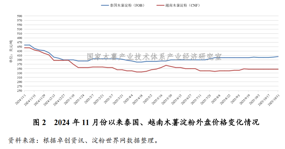 从外盘木薯淀粉市场行情来看,由于鲜薯原料供应增量有限,本周泰国木薯淀粉新增产量有限;越南鲜薯供应量稳中有升,木薯淀粉供应量持续增加。受中国港口库存缓慢回落、北方地区粉条工厂和南方地区烟花爆竹工厂开工率回升等因素影响,泰国和越南木薯淀粉出口总体呈稳中有升态势。本周泰国木薯淀粉价格上升,越南木薯淀粉价格稳定。其中,泰国和越南木薯淀粉报价区间为FOB(曼谷)390~420美元/吨(约合人民币2765.10~2977.80元/吨),较上周增长2.5美元/吨;越南木薯淀粉报价区间为CNF340~355美元/吨(约合人民币2410.60~2516.95元/吨)(见图2)。