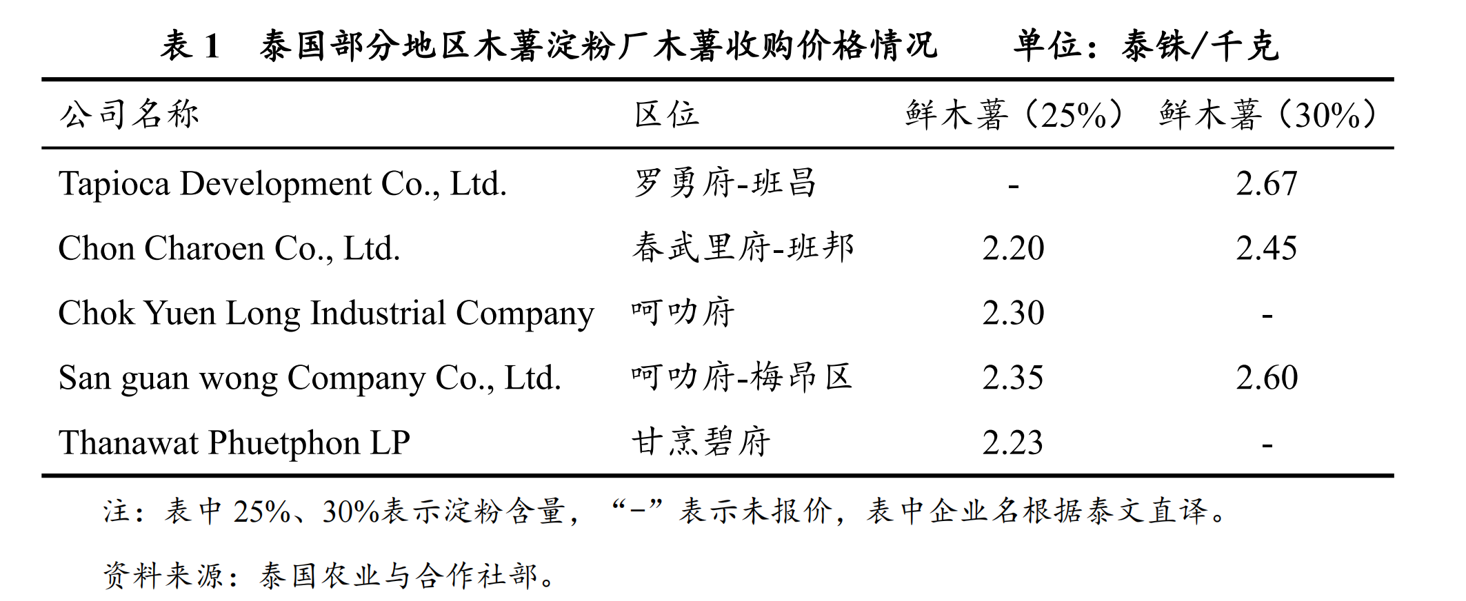 泰国农业与合作社部的数据显示,本周泰国国内鲜薯平均收购价格为2.05泰铢/千克(约合人民币449.56元/吨),较上周增长0.07泰铢/千克。泰国农业与合作社部监测的几家淀粉厂的鲜薯收购价为2.20~2.67泰铢/千克(见表1,约合人民币482.47~585.53元/吨)。其中,春武里府-班邦和罗勇府-班昌的鲜薯收购价格上升。