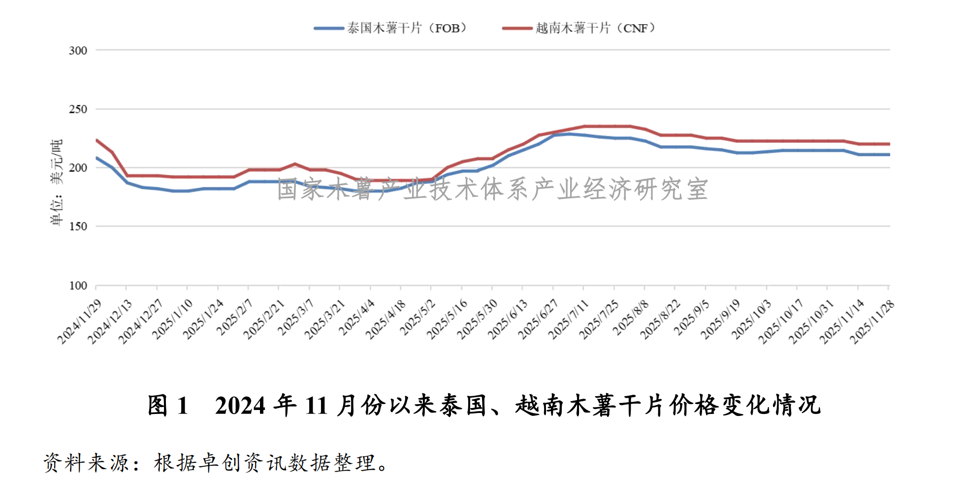 泰国和越南木薯干片市场价格保持稳定,泰国和越南木薯淀粉市场价格上升,国内木薯淀粉市场价格大幅上升。近期,泰国和越南鲜木薯因雨季收购难度增大,木薯干缺乏晾晒条件,导致市场供应量有限,工厂持续持挺价心态。本周泰国和越南木薯干片市场价格保持稳定。其中,泰国木薯干片报价区间为FOB(曼谷)210~212美元/吨(约合人民币1486.80~1500.96元/吨);越南木薯干片报价为CNF220美元/吨(约合人民币1557.60元/吨)(见图1)。
