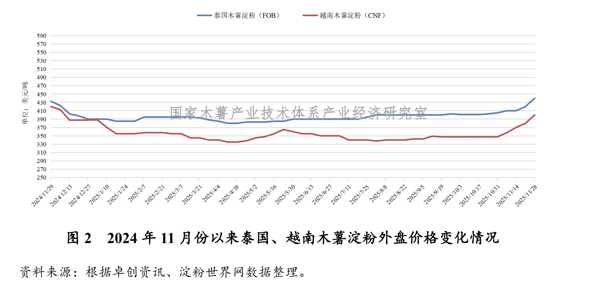 从外盘木薯淀粉市场行情来看,由于鲜薯原料供应增量有限,本周泰国木薯淀粉产量与上周大体持平,成品库存量持续下降;越南木薯淀粉产量有所回升。受中国港口库存持续回落的影响,泰国和越南木薯淀粉出口总体呈稳中有升态势。本周泰国和越南木薯淀粉价格持续上升。其中,泰国和越南木薯淀粉报价区间为FOB(曼谷)430~450美元/吨(约合人民币3044.40~3186.00元/吨),较上周增长20美元/吨;越南木薯淀粉报价区间为CNF390~410美元/吨(约合人民币2761.20~2902.80元/吨),较上周增长20美元/吨(见图2)。