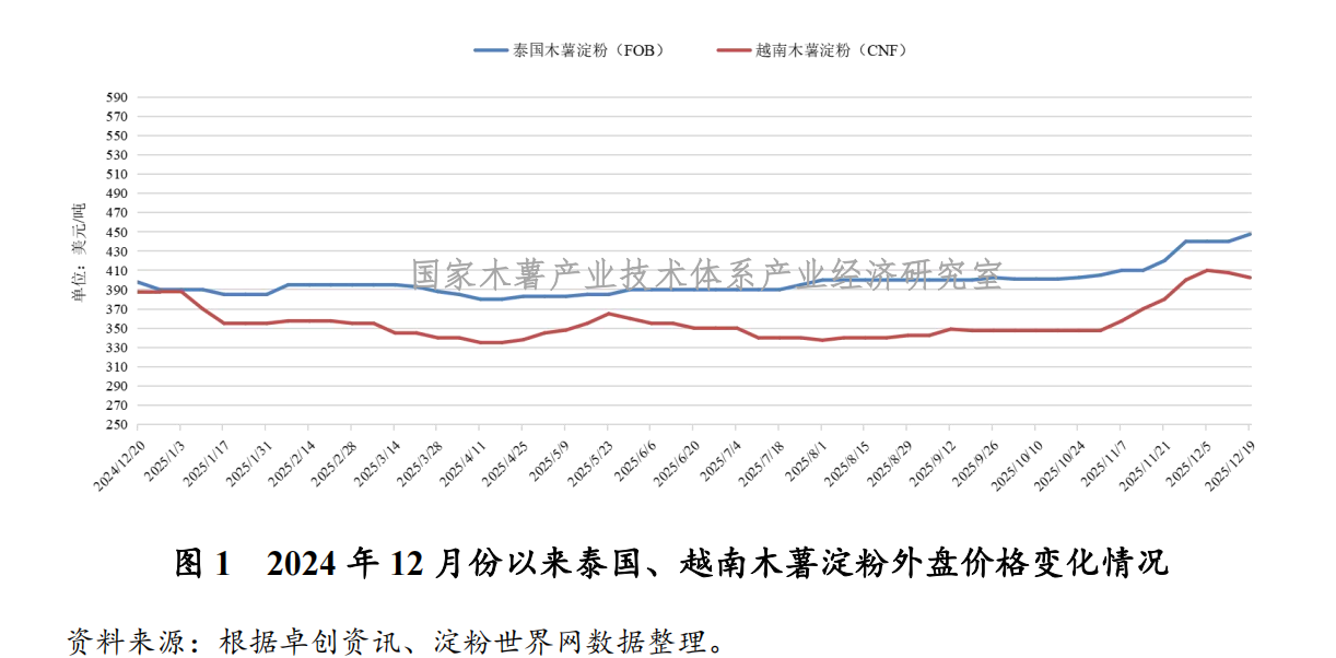 从外盘木薯淀粉市场行情来看,由于鲜薯原料供应量持续增加,本周泰国木薯淀粉产量有所回落,成品库存量有所减少;越南木薯淀粉产量持续增加。受淀粉产量和库存不足以及中国港口库存有所回升的影响,泰国木薯淀粉出口总体呈震荡观望态势;受泰柬边境冲突和越南北部降雨导致产量下降以及外部需求回暖等因素的综合影响,越南木薯淀粉出口总体呈震荡观望态势。本周泰国木薯淀粉价格上升,越南木薯淀粉价格持续下降。其中,泰国和越南木薯淀粉报价区间为FOB(曼谷)440~455美元/吨(约合人民币3106.40~3212.30元/吨),较上周增加7.50美元/吨;越南木薯淀粉报价区间为CNF385~420美元/吨(约合人民币2718.10~2965.20元/吨),较上周下降5美元/吨(见图1)。