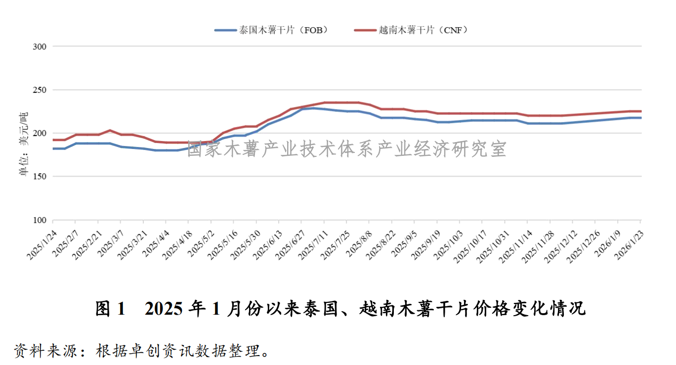泰国和越南木薯干片市场价格持平,泰国木薯淀粉市场价格上升,国内木薯淀粉市场价格涨跌分化。近期,泰国和越南鲜木薯收购价格保持高位,工厂木薯干库存有限。本周泰国和越南木薯干片市场价格持平。其中,泰国木薯干片报价区间为FOB(曼谷)215~220美元/吨(约合人民币1505.00~1540.00元/吨);越南木薯干片报价为CNF225美元/吨(约合人民币1575.00元/吨)(见图1)。