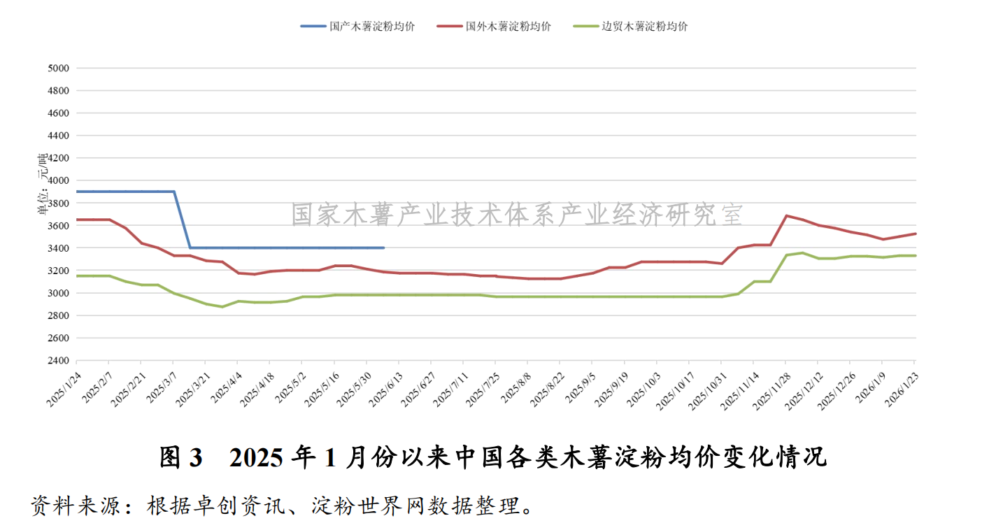 本周国内木薯淀粉价格涨跌分化。其中,泰国中高端木薯淀粉含税报价为3450~3700元/吨,较上周增加50元/吨;越南主流木薯淀粉含税报价为3100~3350元/吨,较上周下降25元/吨;广西边贸市场主流木薯淀粉报价为3140~3520元/吨;随着鲜薯采挖季进入末期,国内木薯淀粉生产从本周开始陆续进入本榨季收尾阶段,价格基本与上周持平。(见图3)。