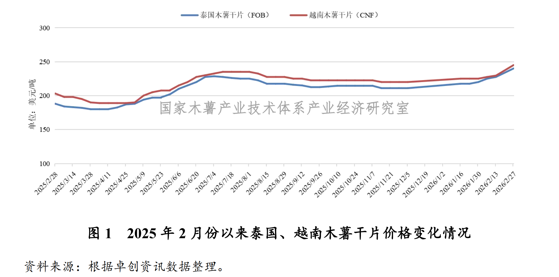 泰国和越南木薯干片市场价格持续上升,泰国和越南木薯淀粉市场价格上升,国内木薯淀粉市场价格上升。近期,泰国和越南原料木薯收购价格高企,木薯干供应有限。本周泰国和越南木薯干片市场价格持续上升。其中,泰国木薯干片报价区间为FOB(曼谷)240美元/吨(约合人民币1663.20元/吨),较2月14日增加12.50美元/吨;越南木薯干片报价为CNF245美元/吨(约合人民币1697.85元/吨),较2月14日增加15.50美元/吨(见图1)。
