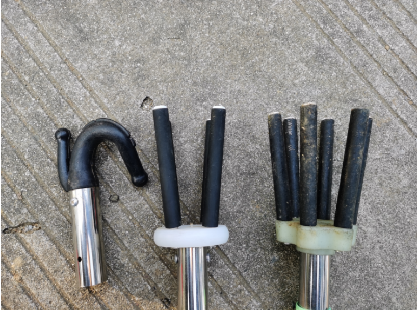 摇摆式配备的弯钩、四爪和六爪三种采摘头(从左至右)