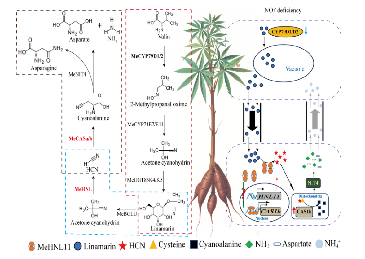 研究团队通过研究发现,低氮诱导生氰糖苷从叶片运输至根系,经BGLU和MeHNL11分解产生氰化物;氰化物作为信号分子促使MeHNL11从细胞质进入细胞核,直接激活氰化物合成酶基因MeCAS1b的转录,加速氰化物转化为氨基酸和铵,从而补充植物氮素需求。